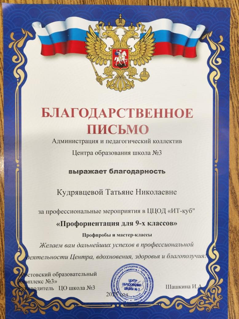 Благодарность управления туризма, культуры, молодежи и спорта администрации Ростовского муниципального района